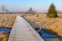 Een bevroren houten wandelpad aan de Baraque Michel in natuurreservaat de Hoge Venen in België.