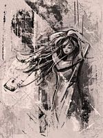 Een houtskool tekening van een vrouw in de wind. Digitaal bewerkt waarbij er verschillende lagen en texturen zijn toegevoegd. Fraai kunstwerk in landelijke stijl met warme aarde tinten en zwarte lijnen.