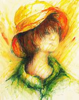 Zon / Portret / Meisje / Vrolijk / Hoed / Gele hoed / Zonne stralen / Aquarel / Figuratieve kunst / Optimistisch / Glimlach / Kijken / Geel / Oranje / Groen /