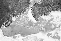 IJs en struiken gezien van bovenaf en dan recht naar beneden kijkend op het ijs. Winter in Nederland en dit gefotografeerd met een drone. Een kunstzinnig beeld zo.