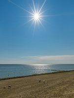 De IJsselmeerdijk nabij Warns op een mooie zomerdag met de zon als ster aan de hemel en het gras laat zien dat er weinig regen voorafgaand is gevallen.