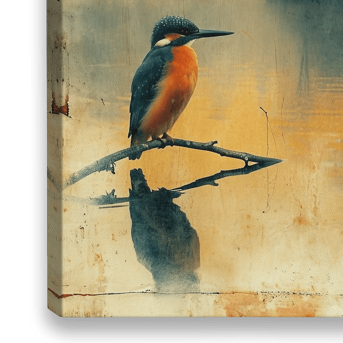 Een muurschildering als decoratieve kunst voor een stijlvol interieur. Een ijsvogel op een tak aan de oever van een meer in grunge vintage stijl.