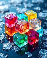 De foto toont een fascinerende opstelling van ijsblokjes in een dynamisch samenspel van vormen en texturen. De ijsblokjes hebben verschillende afmetingen en lijken op elkaar te liggen in een harmonieuze chaos, alsof ze zijn gevangen in een koel moment. Elk ijsblokje reflecteert het licht op zijn eigen manier, waardoor een spel van…