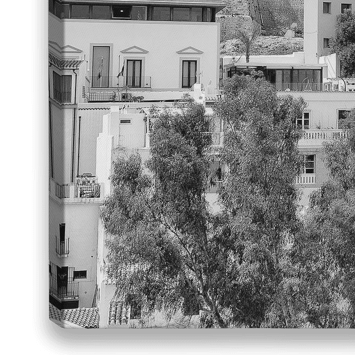 Prachtige zwart-witfoto van de skyline van Ibiza-stad op het wereldberoemde eiland Ibiza (Spanje).
