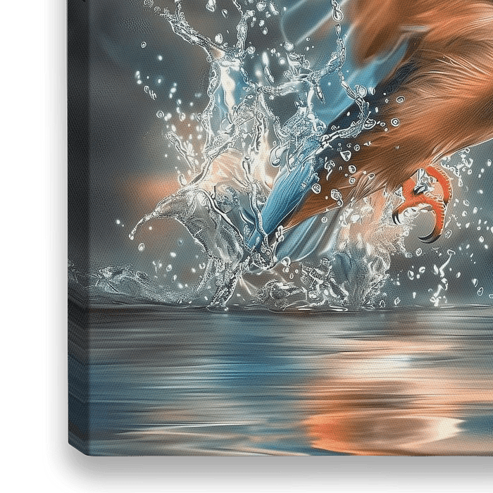 Sprookjesachtige ijsvogel vliegend met waterdruppels. De ijsvogel wordt omringd door roze bloemetjes en schittert door de waterdruppels en fijne details. Prachtig, kleurrijk stuk dat de ruimte tot leven zal brengen.
