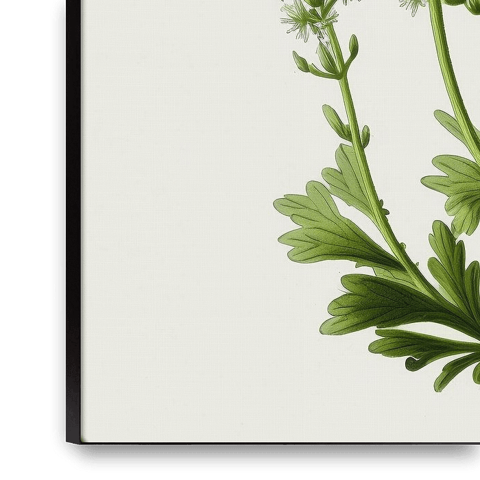 Een zeer gedetailleerde botanische illustratie van een wilde plant met delicate witte bloemen en weelderige groene bladeren, die de schoonheid van de natuur nauwgezet weergeeft. Tegen een eenvoudige achtergrond ligt de nadruk volledig op de organische vorm en subtiele texturen van de plant. Dit kunstwerk in hoge resolutie met zijn…