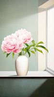 Een stilleven met een vaas met pioenrozen.