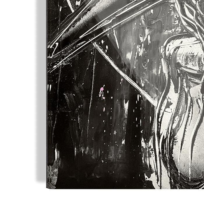 Het schilderij "Imagine" is een ingetogen zwart-wit compositie waarin een vrouw van achteren wordt afgebeeld. Haar silhouet straalt een gevoel van verlangen en introspectie uit, terwijl ze wegkijkt in een ruimte die zowel leeg als geladen lijkt. De enige kleur die het monochrome palet doorbreekt, is een accent in zacht roze, waarin een subtiele tekst is verwerkt. Deze tekst, fragiel en delicaat, weerspiegelt de dromen en verlangens van de vrouw, die zweeft tussen werkelijkheid en verbeelding, op zoek naar een ongrijpbare liefde.