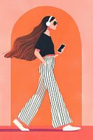 Een stijlvolle illustratie van een hedendaagse figuur in motion, gekenmerkt door een minimalistische maar krachtige compositie. De combinatie van een zwart shirt met een gestreepte broek, witte sneakers en hoofdtelefoon straalt een urban coolness uit tegen een warme koraalrode achtergrond met boogvorm. Het lange, wapperende haar en de…