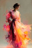 Een adembenemend digitaal kunstwerk van een elegante vrouw in jurk die tot leven komt in een explosie van warme kleuren. De stof lijkt te dansen in vloeiende bewegingen van diep burgundy naar stralend oranje en zacht roze. Het kledingstuk zweeft als een aquarel tussen droom en werkelijkheid, waarbij de transparante lagen stof een…