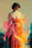 Een digitaal kunstwerk waarin een elegante vrouw gehuld is in een weelderige jurk van vloeiende stoffen in warme tinten van roze, oranje en goud. De beweging van de stof creëert een dynamisch spel van licht en schaduw tegen een turquoise-groene achtergrond, wat resulteert in een dromerige, bijna surrealistische sfeer.