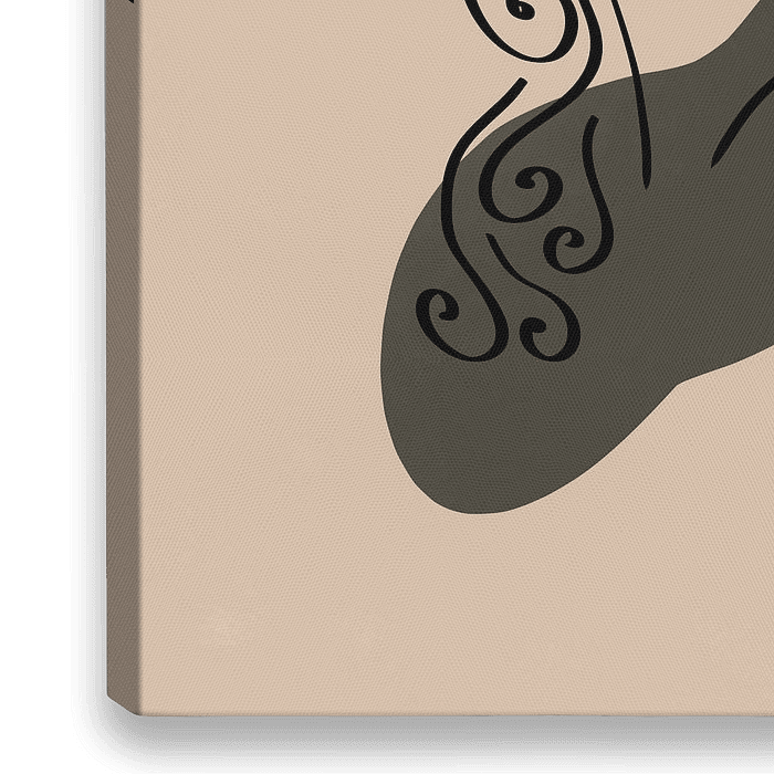 De lijntekening van zwarte inkt is geplaatst op een achtergrond in zand kleur / beige met twee organische vormen in oranje en grijs-groen. De kleuren zijn geinspireerd van de zonsondergang in de zomer en de herfst.