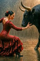 Een moment van stilte, geladen met elektrische spanning - als vlak voor de donder. Twee krachten ontmoeten elkaar in de gouden regen: een flamencodanseres in diepe concentratie en een machtige zwarte stier. De vrouw, gekleed in een natte, roestkleurige jurk die zwaar aan haar lichaam kleeft, hurkt neer - haar houding is niet onderdanig,…