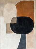 Dit werk speelt met vorm en tegenvorm. Vier gesloten vlakken schuiven in elkaar als elementen die elkaar net raken, zonder te botsen. De kleuren zijn verzadigd maar gedempt: diep zwart, roestbruin, steenwit en een koel grijsblauw houden elkaar in balans.