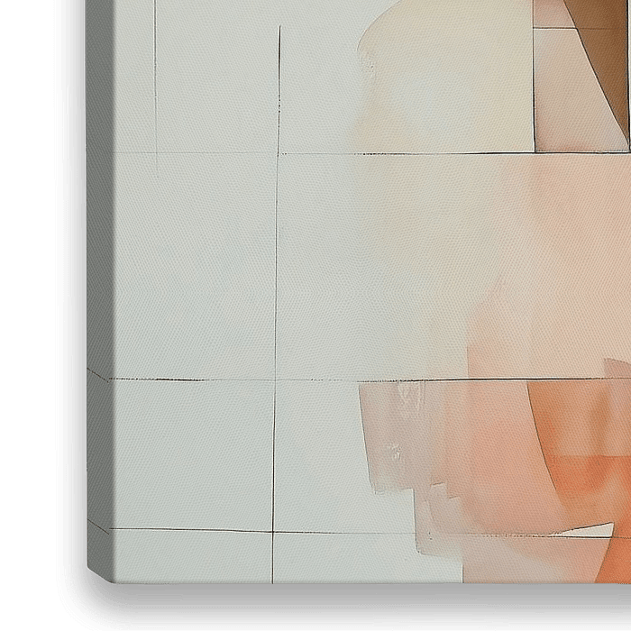 Een aquarel van een vrouw in de stijl van het kubisme met gedempte kleuren, geometrische vormen en patronen, tegen een achtergrond met vlakken en vage randen. De warme tinten en zachte belichting geven het geheel een uitstraling van rust.