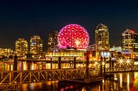 Prachtig avondzicht op False Creek in het centrum van Vancouver met de verlichte skyline en Science World. Op de voorgrond is de aanlegsteiger van een veerboot.