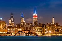 Schilderachtig uitzicht op Midtown Manhattan vanaf Pier A Park, New Jersey. Het Empire State Building torent in het midden van het tafereel, feestelijk verlicht in de kleuren van de Amerikaanse vlag en een van de beroemdste bezienswaardigheden van de stad. Links staat de futuristisch ogende One Vanderbilt, een andere opvallende…
