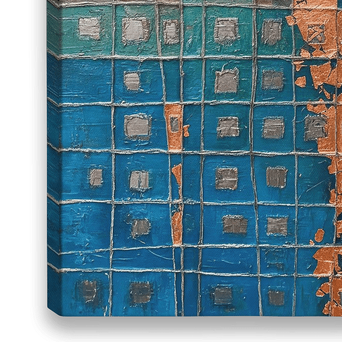 Koop dit abstracte kunstwerk Industrieel Abstract Raster: Koper, Blauw, Groen en Textuur van STUDIO ARTSY als print op canvas, aluminium dibond, (ingelijste) fotoprint, behang en ArtFrame. Voor jou op maat geprint in Fine-Art kwaliteit.
