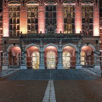 De ingang van de Academiegebouw (RUG) te Groningen bij avond. De foto is in het vierkant. Het gebouw is prachtig verlicht.