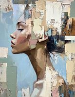 eigentijdse combinatie van abstractie en figuratieve kunst. Het zijprofiel van een vrouw vormt het centrale element, weergegeven met delicate details die haar kalmte en elegantie benadrukken. Haar gesloten ogen en ontspannen houding stralen introspectie en innerlijke rust uit. De zachte huidtinten worden omlijst door abstracte vlakken en ruwe penseelstreken in pastelkleuren zoals lichtblauw, roze, beige en een vleugje groen, die een dynamisch contrast bieden met de realistische weergave van het gezicht.