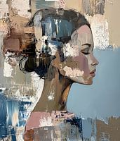 dromerig en introspectief portret van een vrouw, waarbij haar gezicht in profiel wordt weergegeven tegen een abstracte achtergrond. De zachte, verfijnde trekken van het gezicht contrasteren mooi met de ruwe, expressieve penseelstreken die de achtergrond vormen. De kleuren zijn subtiel en aards, met tinten van blauw, beige, bruin en enkele roze accenten, wat een gevoel van rust en introspectie creëert.