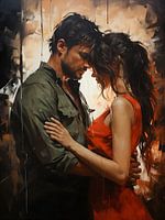 In het schilderij staan twee verliefde zielen tegenover elkaar, hun hoofden zachtjes tegen elkaar aan. Een intiem moment van liefde en tederheid maar ook zorgen, waarin tijd lijkt te vertragen en hun harten één worden.