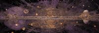 Dit werk toont een complex intergalactisch verbindingselement dat straalt in de donkere leegte van de ruimte. De gouden en paarse tinten geven het geheel een majestueuze uitstraling, terwijl de centrale structuur met zijn gedetailleerde lijnen en cirkels een technologisch wonder suggereert. Het langwerpige ontwerp met symmetrische…