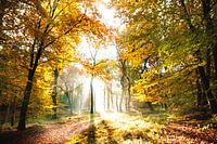 Herfst in het bos, het gele bladerdek van de bomen dat door een laagstaande zon met tegenlicht beschenen wordt. Licht aan het einde van het pad.