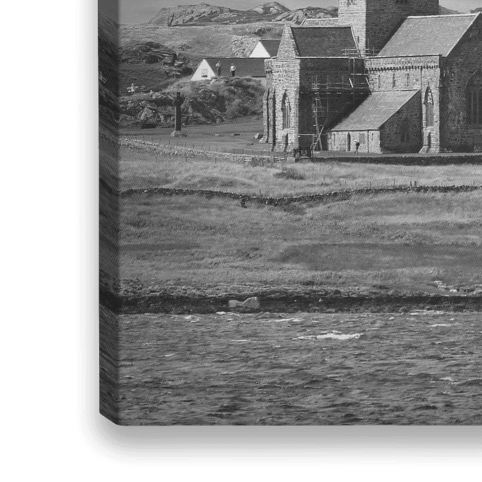 De abdij van Iona, een van de oudste christelijke religieuze centra in West-Europa, op het eiland Iona in de Schotse Hooglanden. Gezien vanaf het eiland Mull in Schotland in de zomer.