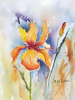 Deze aquarel vangt de schoonheid en energie van een irisbloem in warme, vurige tinten van oranje, rood en geel. De stralende bloembladen lijken haast te gloeien en vormen een prachtig contrast met de zachte, dromerige achtergrond. Hierin mengen lila, blauw en subtiele groentinten zich moeiteloos door de vloeiende penseelstreken, wat een…