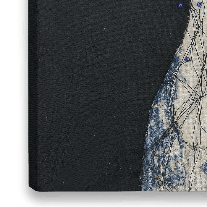 Een figuratief werk van zwart draad, textiel, acryl & kralen.