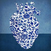 Digitaal vervaardigde illustratie van een menselijk hart in Delfts Blauw.