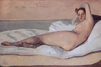 De vrouw poseert naakt op dit schilderij als naaktmodel op een naaktportret. Haar lange benen nemen een groot deel van het portret in beslag doordat ze met haar torso weggedraaid ligt met één borst zichtbaar.