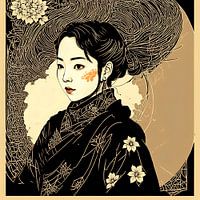 Jonge Japanse vrouw in traditionele kledij. Warli stijl met aardekleuren en patronen.