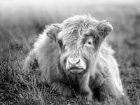Zwart-wit portret van een pasgeboren Schotse Hooglander jong. Ik maakte de foto in het natuurgebied Huis ter Heide in Tilburg. Hier leven vele Schotse Hooglanders die graag poseren. Dit rund ziet er zacht en schattig uit liggend in het gras.
