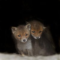 Een stel jonge vossen welpen bij de ingang van hun vossenhol. De pas geboren welpen die nog niet ver van het hol gaan in de periode dat ze net naar buiten komen.
