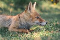 Ontspannen ligt hij in het gras onder een boom en kijkt rustig om zich heen. Gefotografeerd in de duinlandschap van Noord Holland. Mooi zacht achtergrond waardoor de vos er uit springt