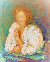Ik was geïnspireerd door het schilderij Het Meisje aan het venster van Rembrandt van Rijn Zij is hier uitgegroeid tot een moderne jonge vrouw in een grof gebreide witte trui. De schaduwen op de trui zijn roze, beige en licht…