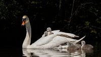 Een moeder zwaan en haar pas uit het ei gekomen jongen. De jonge zwaan zoeken geregeld de beschermende rug van hun moeder op om daar veilig te kunnen rusten of om gewoon een stukje mee te zwemmen.