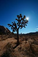 Deze karakteristieke boom staat samen met veel soortgenoten in in Joshua Tree Nationaal Park. Door tegen het licht in te fotograferen ontstaat een silhouette waarbij ook nog een zon te zien is.