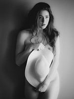 Semi-naakt foto van een jonge vrouw die haar lichaam bedekt met een strohoed.