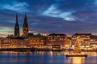Over ‘Jungefernstieg, stadhuis van Hamburg en Nikolaikirchturm met kerstverlichting, in de schemering, Ham’ van Torsten Krüger