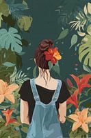 Een illustratie van een vrouw in denim tuinbroek tegen een weelderige tropische achtergrond. Met een hibiscusbloem in het opgestoken haar en omringd door monstera bladeren en lelies in warme oranje tinten, straalt het beeld rust en harmonie uit. De combinatie van het casual denim met de exotische flora creëert een intrigerend contrast.