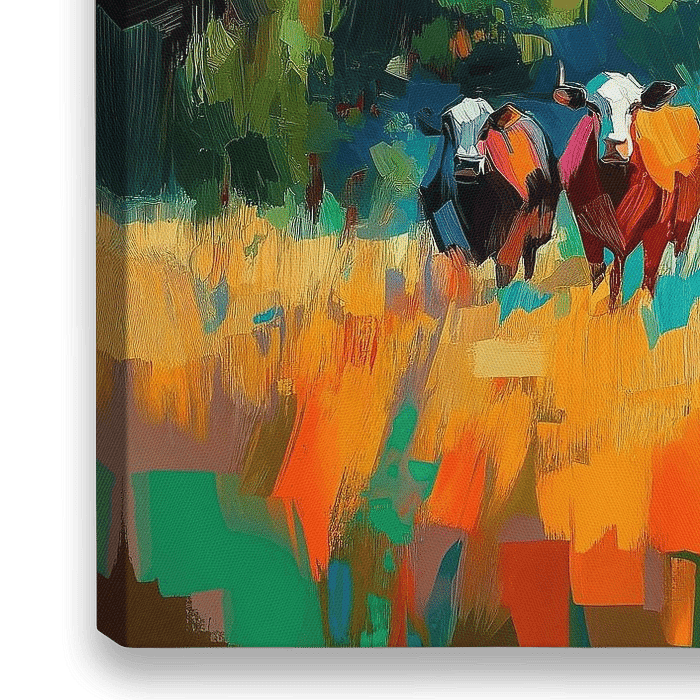 Een kleurrijke, impressionistische weergave van een landschap met een rij koeien tegen een achtergrond van glooiende heuvels en akkerland. Het tafereel is levendig met een helderblauwe lucht en stukken groen en goudkleurig gras.