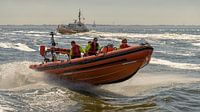 KNRM rib "Chios" van Station Harlingen op volle vaart over de Waddenzeen voor de haven van Harlingen. Op de achtergrond loodsboot "Apollo" van het Loodswezen