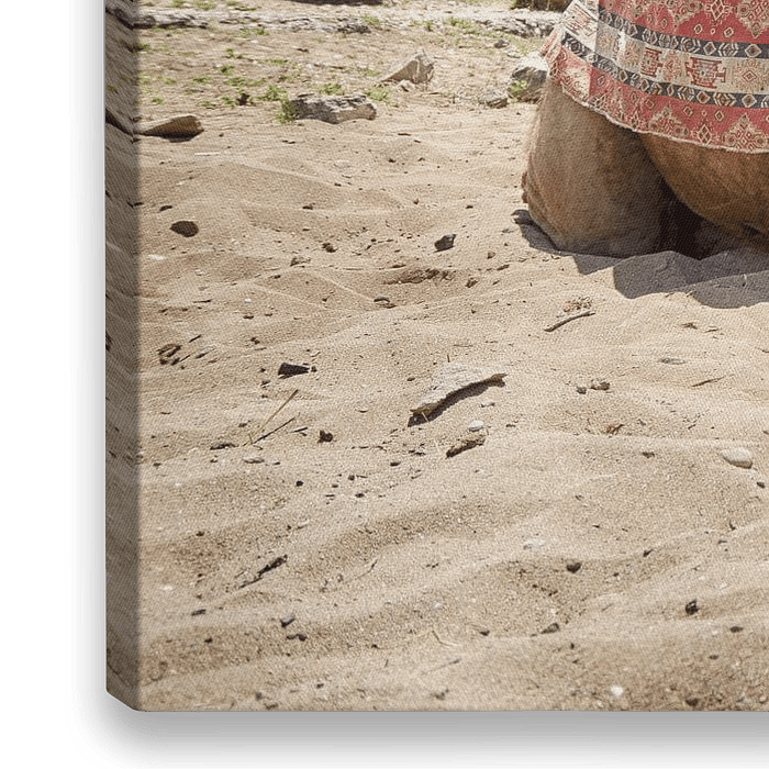 Kameel in Side (Turkije) met prachtig gekleurde kleden op de rug, liggend in het zand en wachtend op toeristen voor een ritje. Op de achtergrond zijn de historische Romeinse opgravingen zichtbaar.