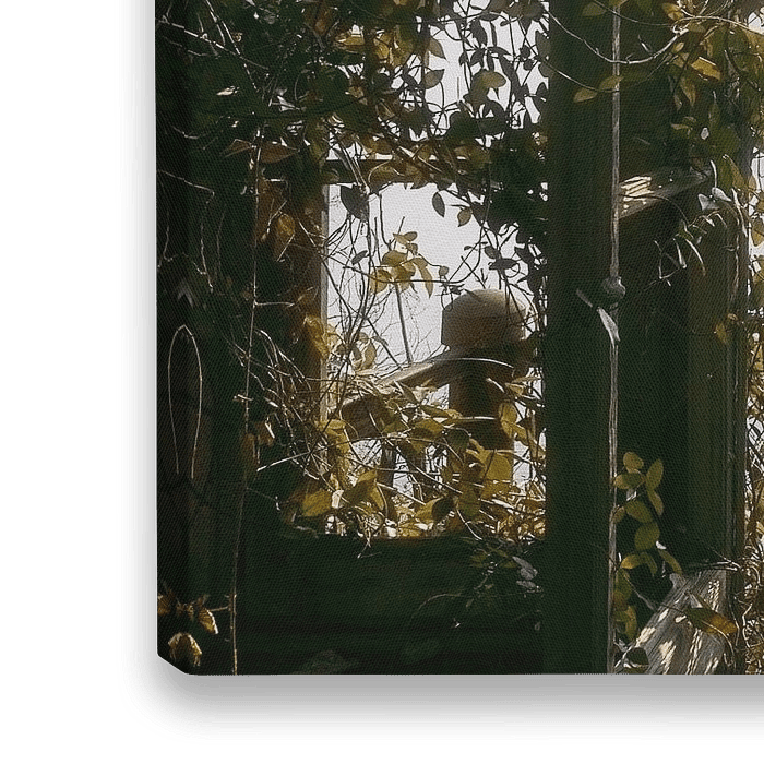 Dit is een foto van een prachtige kamer met een magisch uitzicht direct aan een meer in Zwitserland. De villa is al lang verlaten en planten bedekken de luiken.
