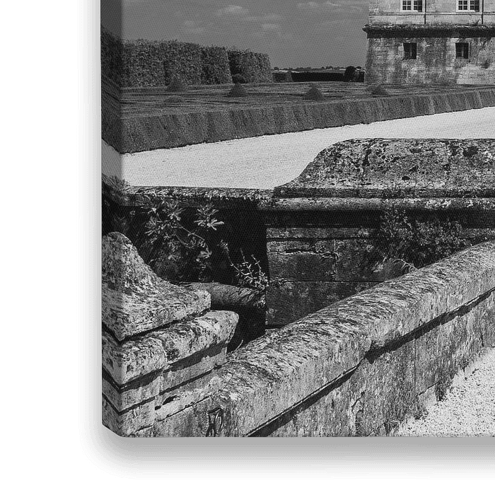 Het verbluffende Chateau de Hautefort rijst sierlijk op van zijn locatie op een heuveltop in de Dordogne in Frankrijk. Het contrasterende zwart-wit accentueert het imposante bouwwerk met zijn hoge torens en ingewikkelde architectonische kenmerken, waardoor een tijdloos en sfeervol beeld ontstaat. De stralend witte binnenplaatsingang van dit historische Franse 17e-eeuwse kasteel maakt de prachtige setting compleet.
