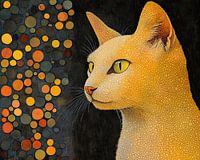 Kat Oog | Gele Kat - Op dit dieren schilderij zie je een gele kat met grote, expressieve ogen, die tegen een achtergrond van kleurrijke, ronde stippen staat, wat het geheel een modern en speels uiterlijk geeft.