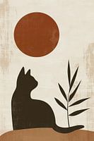 Kat Schilderij | Whisker Serenity - Dit minimalistische dieren schilderij toont een gestileerd silhouet van een kat in een rustende pose tegen een zachte, getextureerde achtergrond. Boven de kat verschijnt een groot, bolvormig object, in warme, roestige roodtinten die de suggestie van een opkomende of ondergaande zon wekken. Naast de…